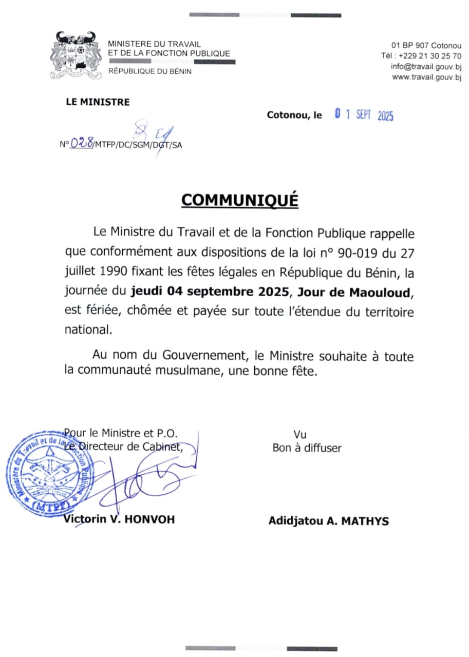 Le Ministre du Travail et de la Fonction Publique porte à l’attention des travailleurs béninois que la Journée du Jeudi 04 Septembre 2025 est déclarée fériée, chômée et payée sur toute l’étendue du territoire national. Cette mesure conforme à la loi est prise en raison de la célébration de la fête de Maouloud.