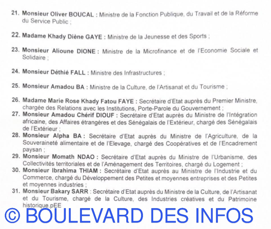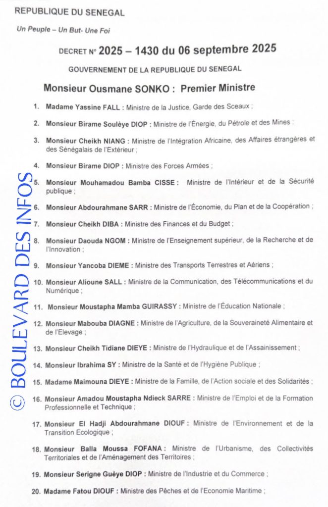Au Sénégal, un nouveau gouvernement est en place. Il a été formé le Samedi 6 Septembre 2025. Selon la nouvelle configuration, on dénombre 31 membres conduits par le Premier ministre Ousmane Sonko. Le nouveau gouvernement sénégalais est composé de 25 ministres et 06 secrétaires d’État. Dans une déclaration, le premier ministre Sonko promet que cette nouvelle équipe sera très laborieuse. Voir ici la liste intégrale.