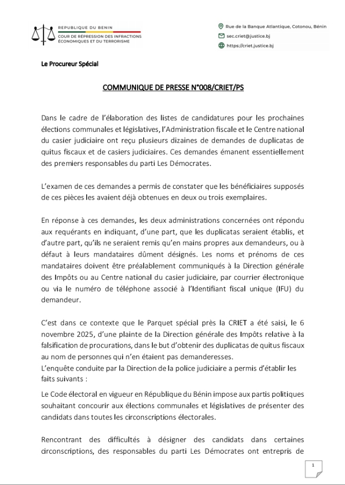 C’est dans ce contexte que le Parquet spécial près la CRIET a été saisi, le 6 novembre 2025, d’une plainte de la Direction générale des Impôts relative à la falsification de procurations, dans le but d’obtenir des duplicatas de quitus fiscaux au nom de personnes qui n’en étaient pas demanderesses.