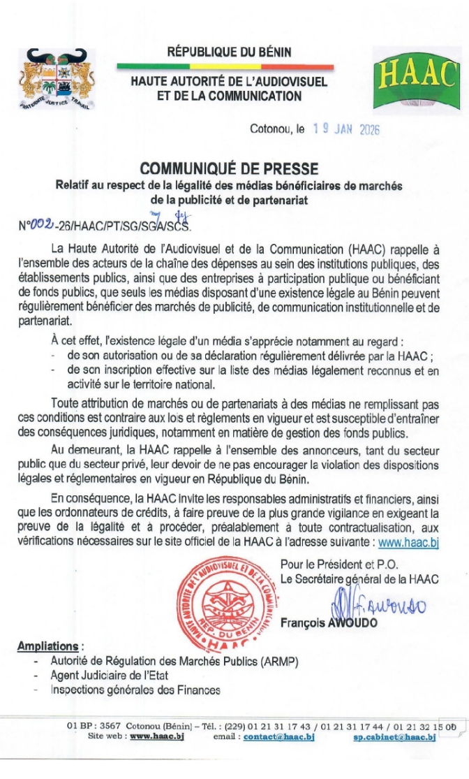 En effet, dans une décision en date du 19 Janvier 2026 et rendue public le mardi 20 Janvier 2026, Dr François Awoudo, Secrétaire Général de l’instance de régulation, informe les responsables financiers et ou ordonnateurs des finances des Institutions publiques et structures de l’État que : « en matière de publicité, de communication et de partenariats médiatiques, seules les collaborations avec des médias légalement reconnus sont autorisées. »