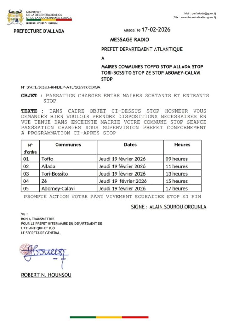 En effet, dans la journée du Jeudi 19 Février 2026, les nouveaux maires Marguerite Agbanzé (Commune de Toffo), Calixte Gnanguènon (Commune d’Allada), Cosme Ayao Akondé (Commune de Tori-Bossito), Agbatri Armando Paolo Gbandé (Commune de Zè) et Nathanaël Koty (Commune d’Abomey-Calavi) prendront officiellement les commandes à travers les subtilités de la cérémonie de passation de service. Le message radio de la préfecture d’Allada invite les concernés à prendre toutes les dispositions nécessaires pour la tenue effective de ces cérémonies dans les enceintes desdites mairies. Voici le programme des passations.