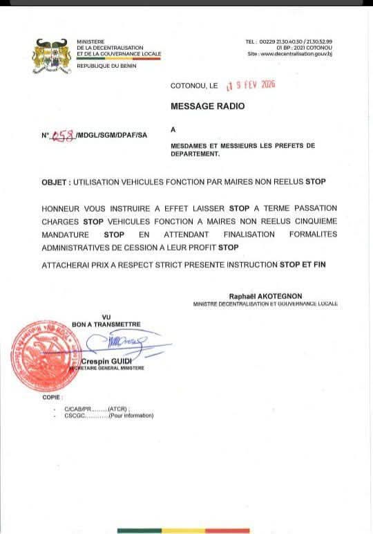 À travers une directive officielle sous forme de message radio et datant du Jeudi 19 Février 2026, Raphaël Akotègnon, Ministre de la Décentralisation et de la Gouvernance Locale, ordonne aux préfets des douze départements, de laisser les véhicules de fonction à la disposition des maires non réélus de la cinquième mandature dès la fin de la passation de charges. Cette mesure restera en vigueur en attendant la finalisation des formalités administratives de cession définitive de ces véhicules à leur profit. Le ministre Raphaël Akotegnon attache du prix au respect strict de cette instruction.