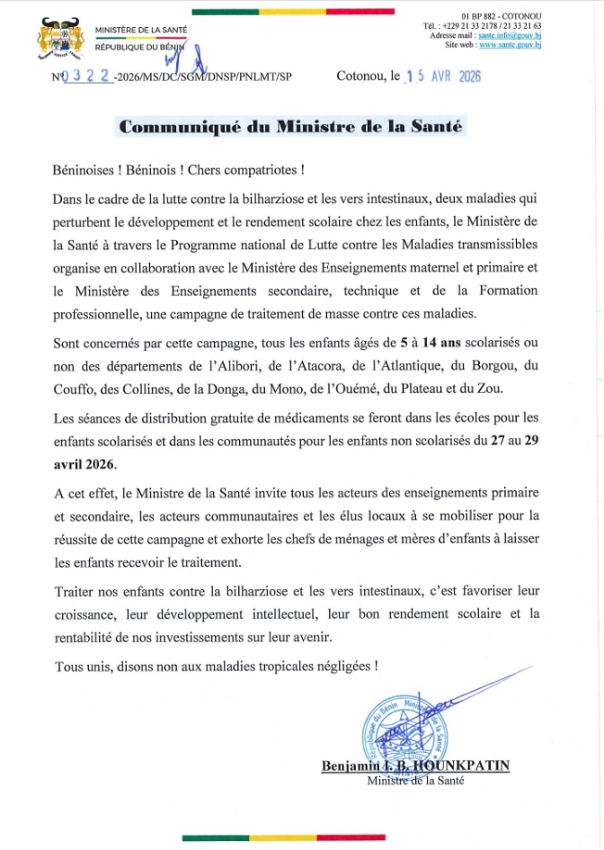 Au Bénin, le Ministère de la Santé lance du lundi 27 au mercredi 29 Avril 2026, une campagne nationale pour traiter gratuitement la bilharziose et les vers intestinaux chez les enfants de 5 à 14 ans. Cette opération, ciblant 11 départements du pays, vise à améliorer la santé et le rendement scolaire en déployant des traitements en milieu scolaire et communautaire. Pour la réussite de cette opération, le Professeur Benjamin Hounkpatin, Ministre de la Santé publique lance un important message aux parents. Consultez le communiqué officiel du ministère pour plus de détails.