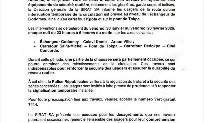 Lire la suite »La Direction Générale de la Société des Infrastructures Routières et de l’Aménagement du Territoire (SIRAT) annonce des T𝐫𝐚𝐯𝐚𝐮𝐱 𝐝𝐞 𝐫é𝐩𝐚𝐫𝐚𝐭𝐢𝐨𝐧…